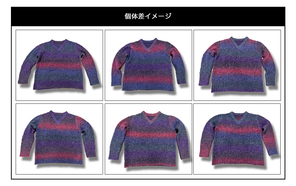 本商品は、グラデーション染をした1本の糸で編み上げる製法となり、セーターごとにグラデーションの柄が異なる仕上がりのため、全て一点ものとなっております。